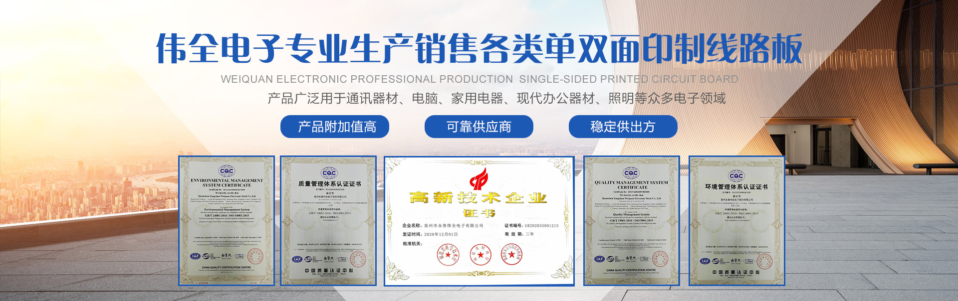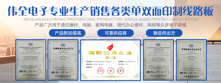 泉州永春偉全電子股份有限公司是一家合資企業。創辦于2011年,專業生產各類單面印制線路板,是福建省專業生產印制線路板的主要廠家,公司坐落在泉州市永春縣桃城鎮留安開發區添福工業園,占地面積達10多畝,交通方便。公司現有員工80多人,總投資3000多萬元人民幣,年生產能力逾20萬平方米。